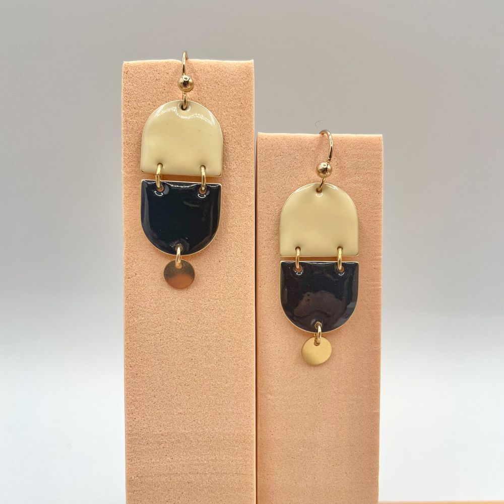 La pièce maîtresse de cette paire de boucles d’oreilles est la combinaison audacieuse de deux demi – ovales en laiton, l’un blanc et l’autre noir. Cette dualité crée un contraste saisissant qui évoque l’harmonie du yin et du yang, de la nuit et du jour. Le design épuré et géométrique de ces demi – ovales ajoute une dimension moderne à l’ensemble.
