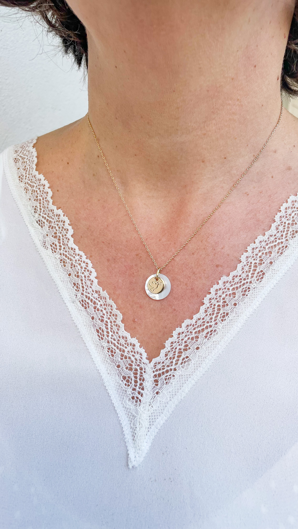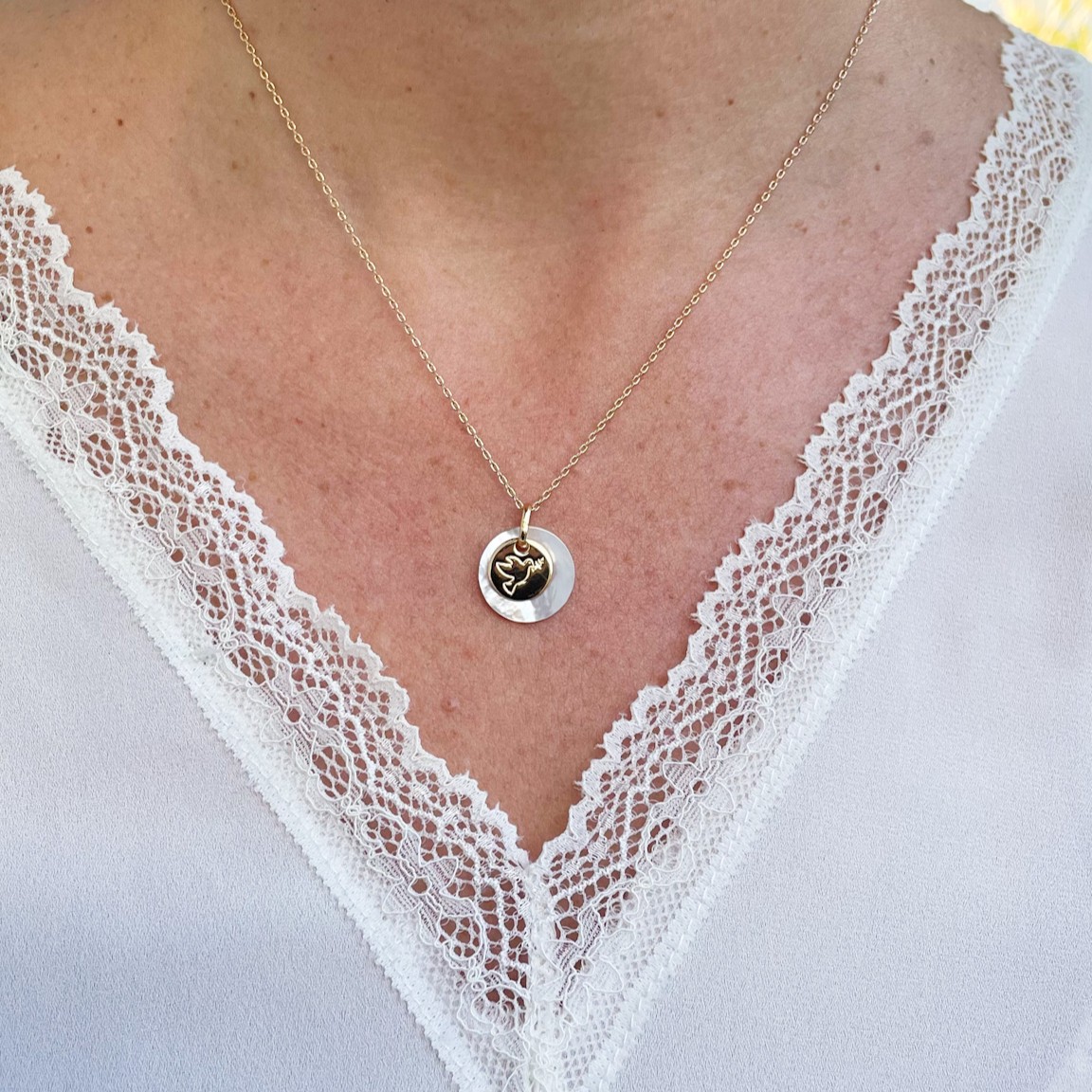 Dans le même style, vous pourriez aimer : le collier médaille nacre blanche et colombe de la paix.