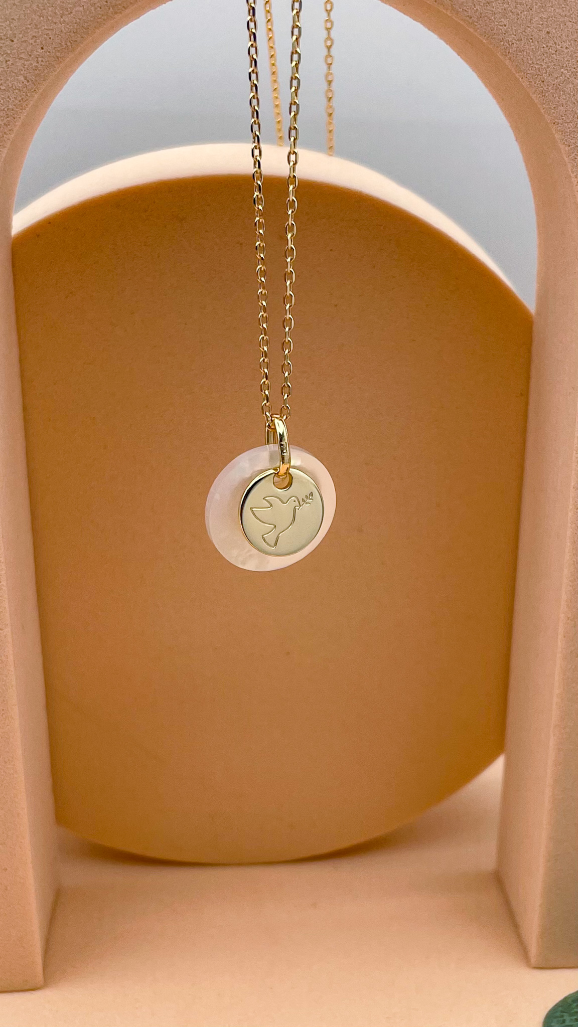 Au centre, la colombe gravée sur une médaille en plaqué or se détache avec finesse, entourée d’un cercle de nacre aux reflets subtils.