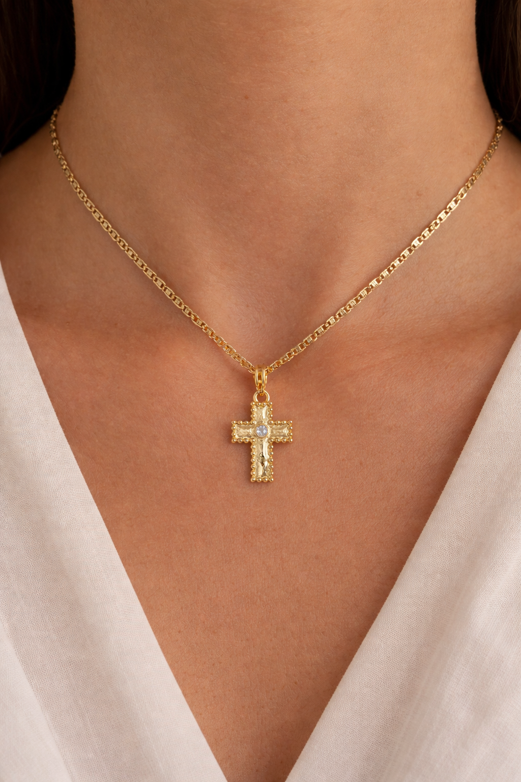 Au centre, une croix fine en plaqué or, subtilement travaillée avec des détails perlés qui lui apportent du relief et du caractère. On craque pour cette croix délicatement ourlé sur son contour.