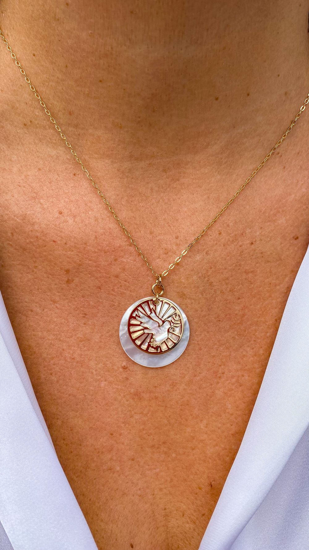 Ce collier catho orné du symbole de l’ Esprit Saint sera un allié au quotidien, à porter toujours sur vous. C’est un bijou religieux contemporain et classique à la fois ! Le Collier médaille ajourée Colombe en plaqué or et nacre | Colombe douce paix est un bijou élégant et discret révélateur de votre foi.