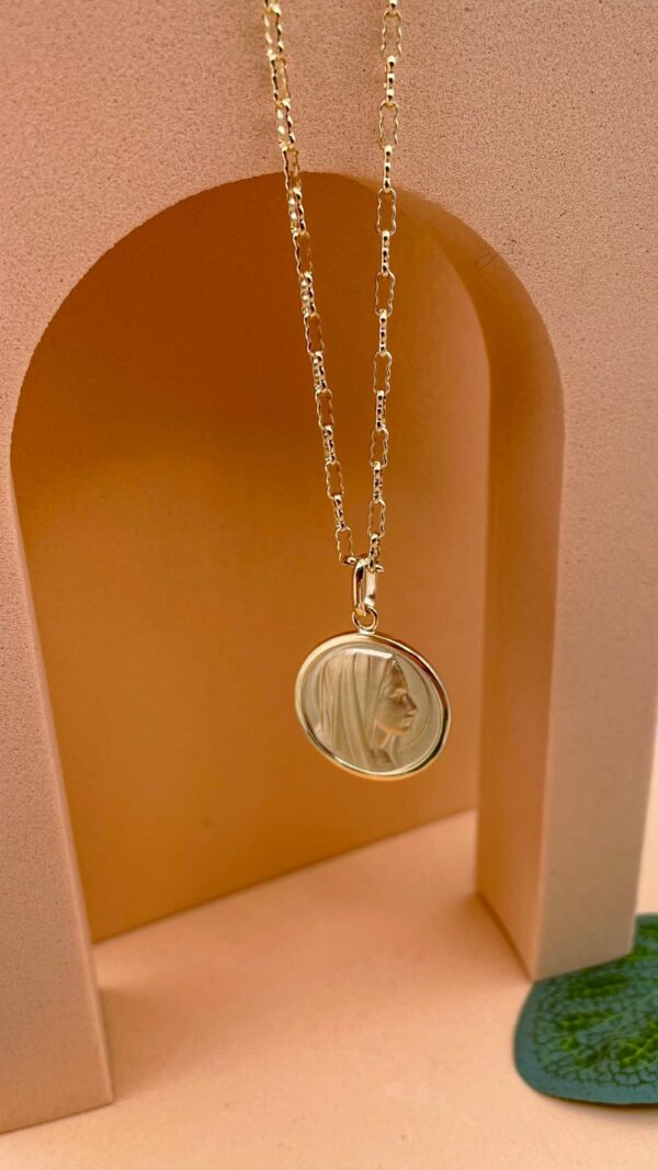 Ce collier médaille Vierge Marie est une invitation à garder près de soi une présence maternelle et rassurante. Inspirée de la tradition chrétienne, cette médaille délicate représente le profil doux de la Vierge Marie, symbole de confiance, d’espérance et de protection.