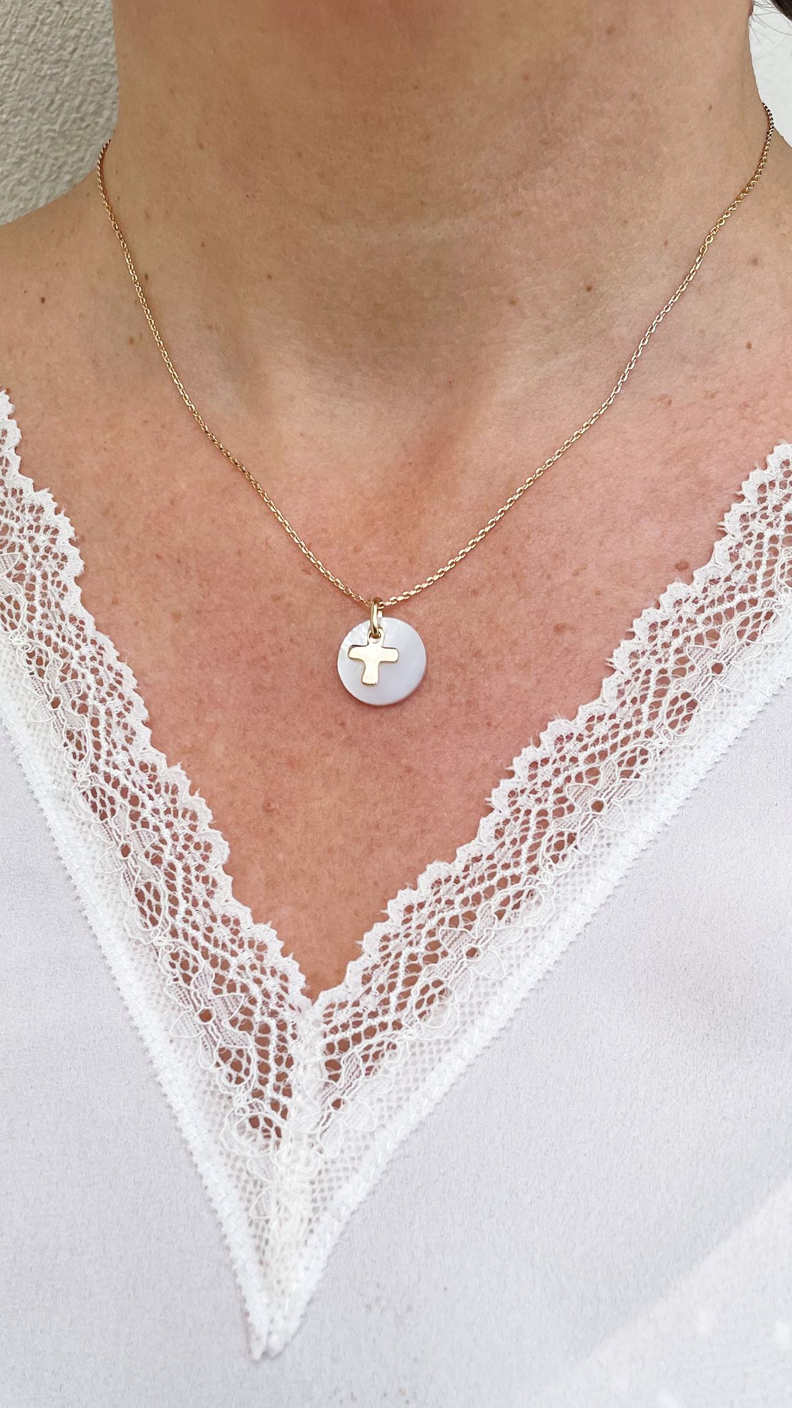 Collier médaille nacre et croix plaqué or – bijou chrétien moderne femme et ado