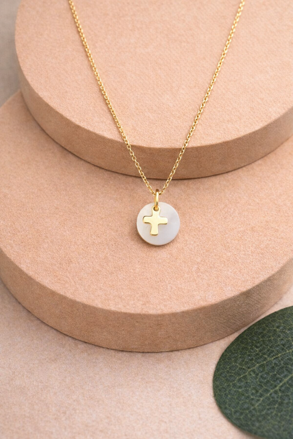 Un collier lumineux et délicat en nacre et croix plaqué or, pour porter sa foi avec élégance au quotidien.